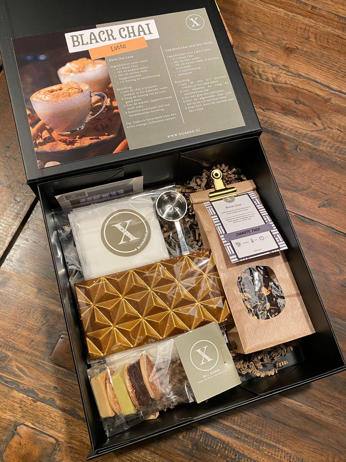Laat je verwennen met het Bij Xann Chai Pakket, een zorgvuldig samengesteld luxe pakket voor iedere chai-liefhebber. Geniet van de volle smaak van onze Black Chai of creëer zelf heerlijke Choco Chai Latte met drie verschillende varianten. Alles wat je nodig hebt om een heerlijk kopje chai te zetten, zit in dit pakket: een handige maatlepel, vulbare theezakjes en een onweerstaanbare chocoladereep om van te snoepen.